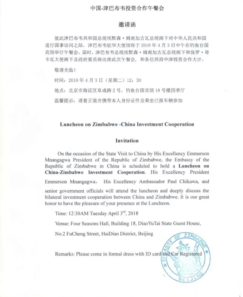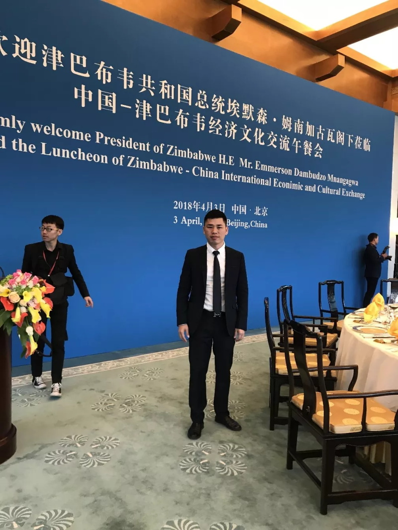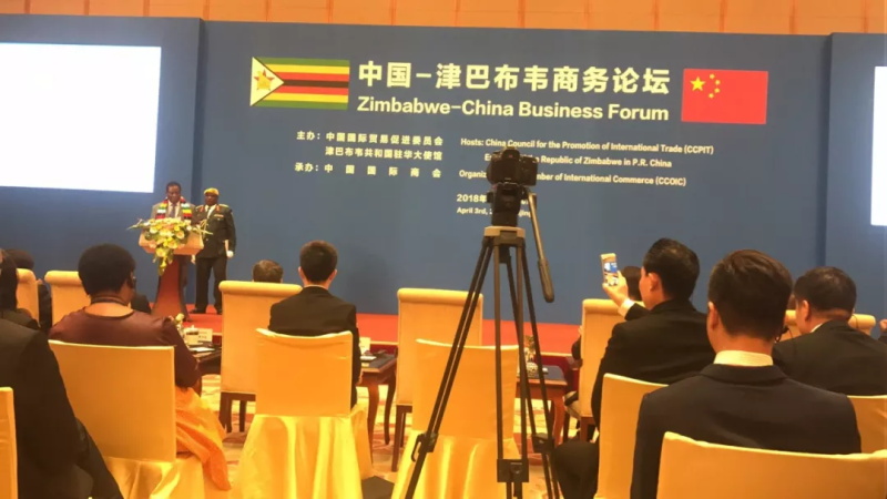 2018年4月3日上午,津巴布韋新任總統(tǒng)埃默森·姆南加古瓦出席了在釣魚臺國賓館舉辦的中國-津巴布韋商務論壇并發(fā)表演講。津巴布韋工業(yè)商業(yè)和企業(yè)發(fā)展部部長麥克·比姆哈、津巴布韋財政部長帕特里克·奇納馬薩等政府官員,以及上百名中國與津巴布韋商界人士參加此次論壇。