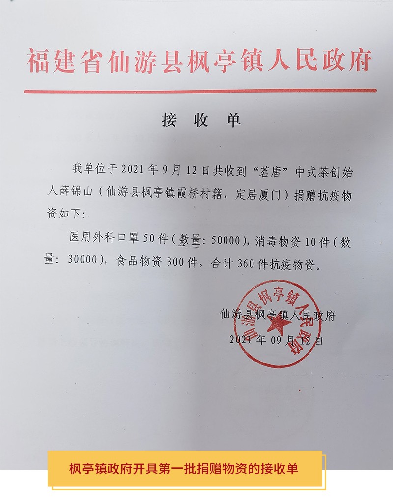 “茗唐”中式茶創(chuàng)始人薛錦山(仙游縣楓亭鎮(zhèn)籍),心系家鄉(xiāng)疫情,第一時(shí)間組織防疫物資,于2021年9月12日晚把第一批抗疫物資送達(dá)楓亭鎮(zhèn)政府,這是續(xù)2020年2月份疫情后再次助力楓亭鎮(zhèn)政府同心抗疫。