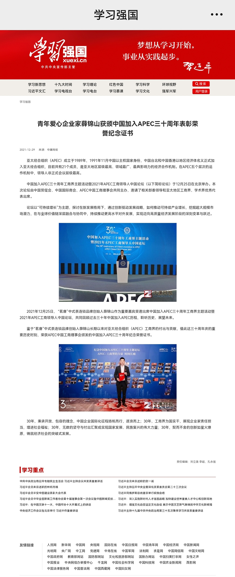 祝賀 | “茗唐”創(chuàng)始人薛錦山獲頒中國加入APEC三十周年榮譽(yù)證書并榮登“學(xué)習(xí)強(qiáng)國”