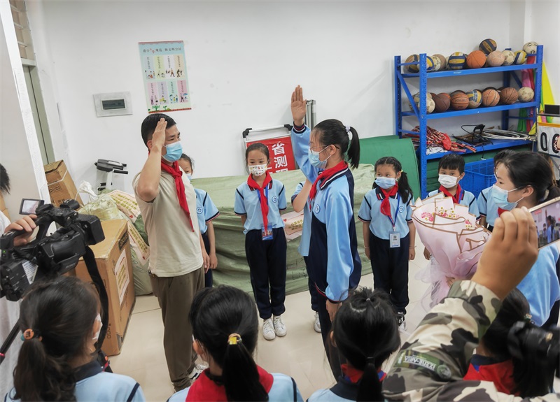 少先隊(duì)員代表向薛錦山校友系帶紅領(lǐng)巾并行少先隊(duì)禮,獻(xiàn)上鮮花,以最簡(jiǎn)單最淳樸的方式表達(dá)了對(duì)學(xué)長(zhǎng)薛錦山最衷心的感謝和誠(chéng)摯的祝福。